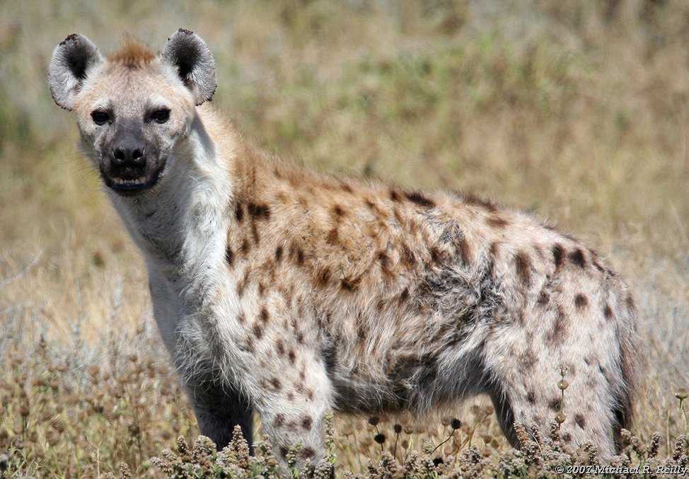 Пятнистая гиена. Размер в длину около 1,3 м, в высоту– 0,8 м. Шерсть бело-серая, с темно-бурыми пятнами по бокам и бедрам. Черный хвост. Обитает в Африке. Если сталкивается с полосатой гиеной, безжалостно вытесняет ее. Она крупнее и сильнее остальных особей, поэтому вызывает больший страх.